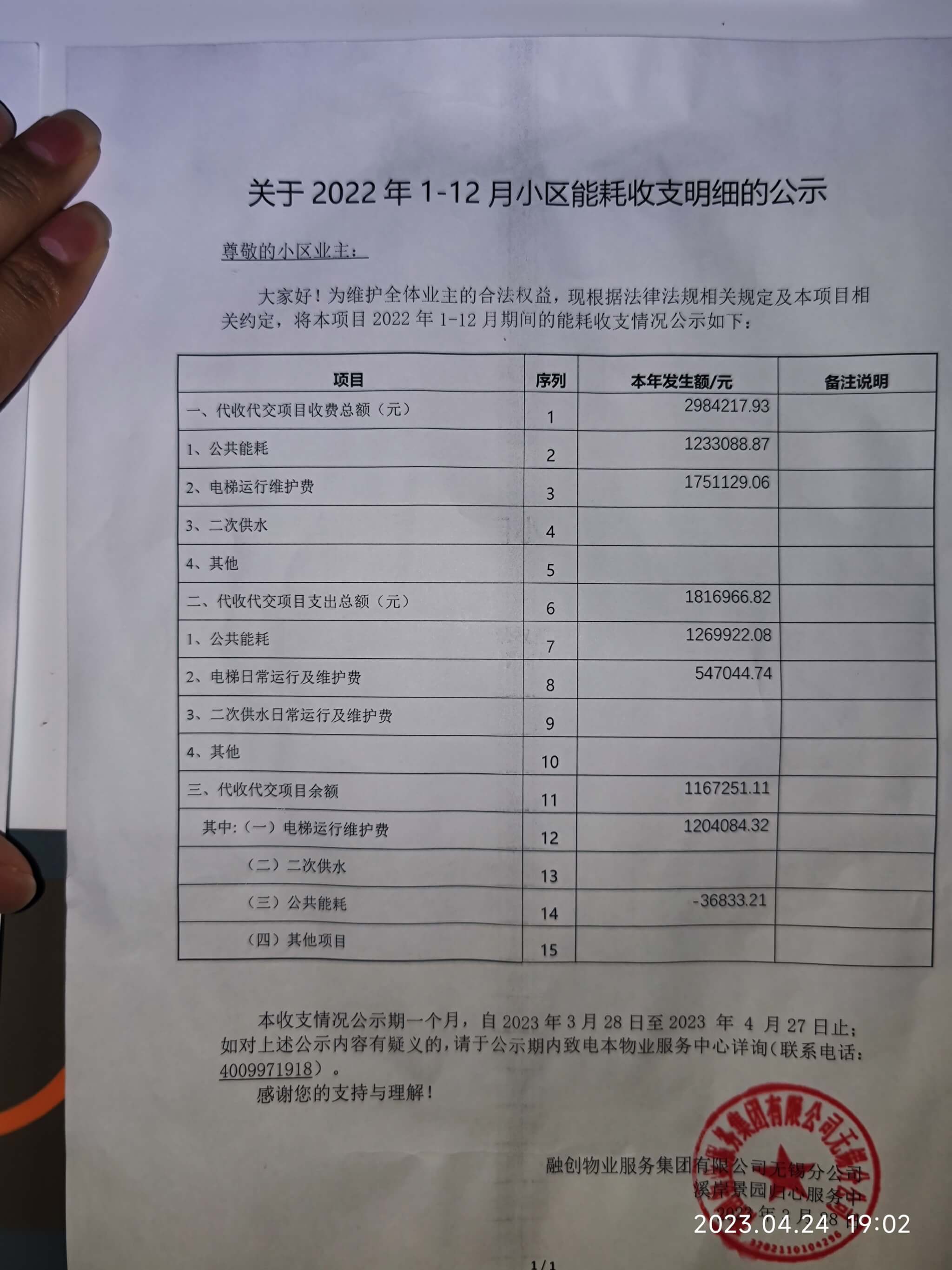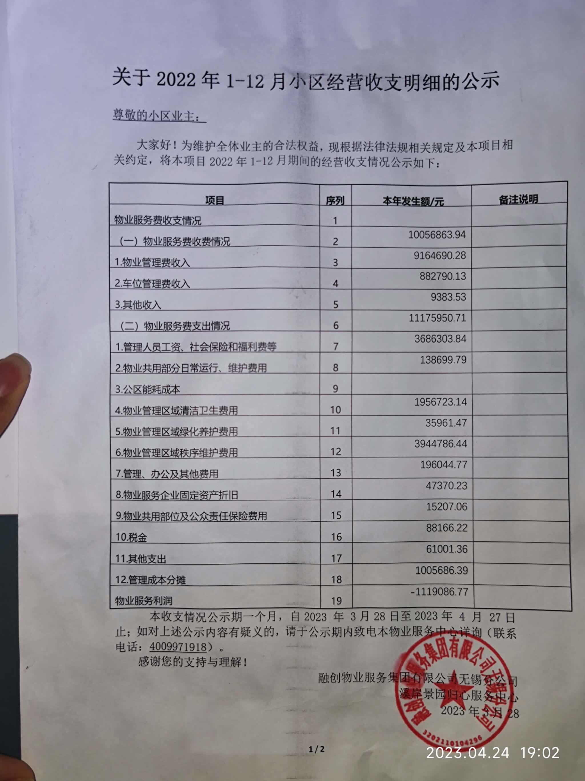 该公示文档曾于2023年4月24日 公示于无锡融创山湖院墅小区8幢前(小区内公司栏)应为所载内容比较离谱,经过投诉后物业公司解释是朗山+兰园+山湖院墅小区3个小区的财务状况,因此作废从新公司了单独山湖院墅小区的财务状况。